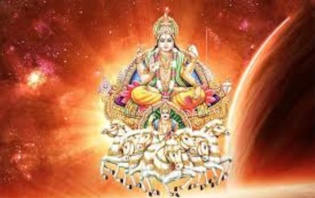 A sun/star god is driven by a 7-horsed Chariot depicting the 7 days of the week and the 7 colors of rainbow which are seen due to the dispersion of the Sun's rays.