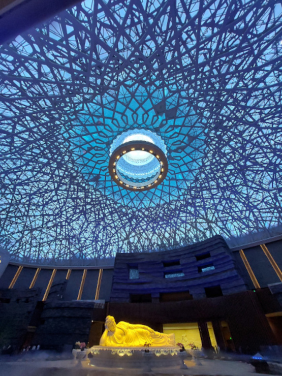 The focal point of the Chan State Scenery is the large reclining Sakyamuni statue that slowly rotates 360 degrees. Admire the latticed ceiling, alcoves filled with buddhas, bronze trees, and LED lights.
