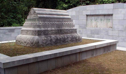 The Zheng He Cultural Park is the burial site of Zheng He. The tomb, restored in 1985, retains traditional Hui and Muslim burial customs. It features a horseshoe-shaped stone mausoleum made of bluestone, with a tomb cover carved with yunjin and lotus patterns, along with Arabic inscriptions. A stone tablet embedded in the rear wall bears the inscription “Tomb of Zheng He” in carved clerical script: