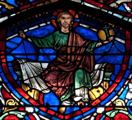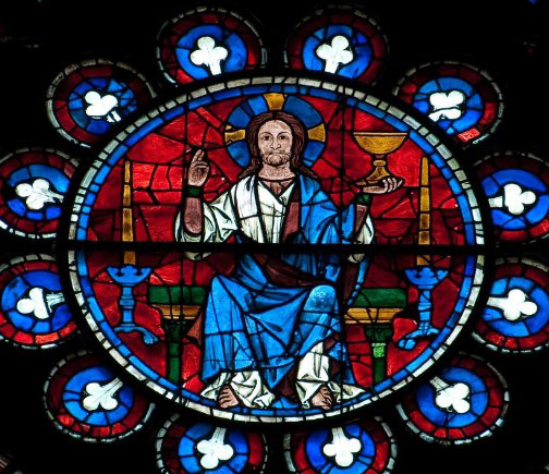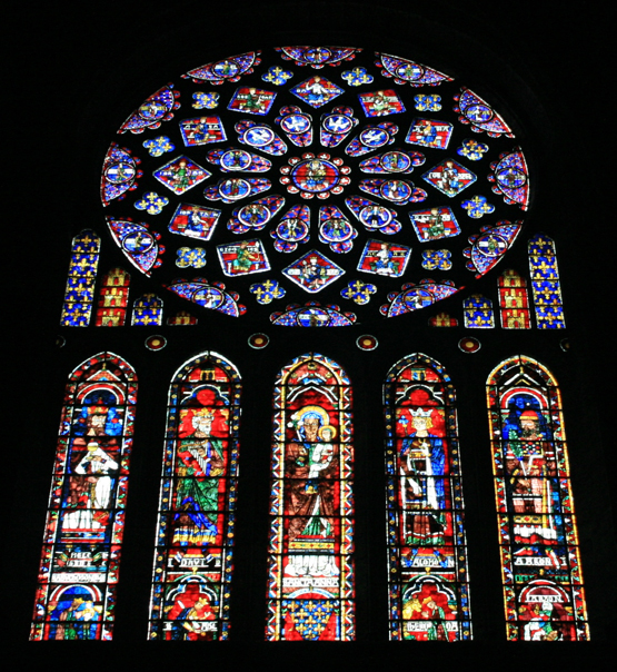 The North side has Jesus holding a cross, the South Rose window has in its center Jesus holding the grail. The West Rose window, the Royal window, from around 1215, has the Cosmic Christ with open arms in its center. See details.