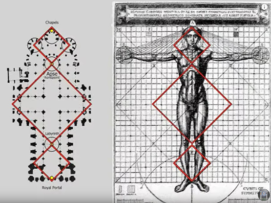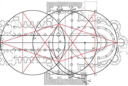 The foundation plan of this Cathedral is based on the Golden Mean Proportion, the Devine Law governing Number, Weight and Measure. The length of the Nave+Choir+Apse vs the Transepts and the distance between pillars are multiples of the Golden Number, derived from the two, golden-mean placed, circles drawn in the ground by a rope+knots+pins, plus the pentagons & diagonals, of their five pointed stars: