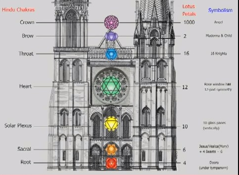 Each side is a miniature pilgrimage church, with a west front with 3 portals and porches where figure sculpture stresses the mission of the church to teach and preach. The north portal, contains over 700 figures and shows the old-testament antecedents of Christ. The south side, the side of the Sun (Christ), shows the new testament era of the church. 4500 sculptures adorn all 9 outside wall portals and show the history of mankind, the summa of all essential knowledge. The west facade shows all 10 chakras via the number of pedals equal to the Hindu chakra system: