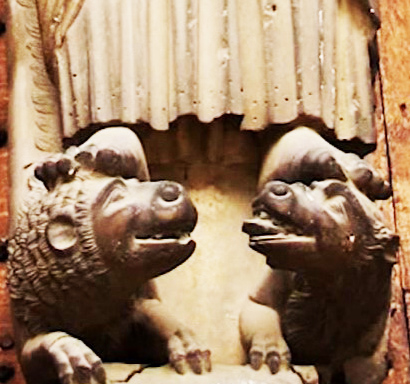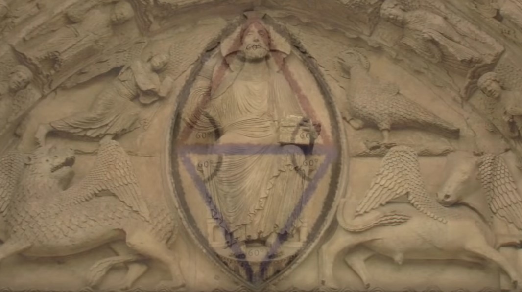 The central portal represents the Christ in Majesty at the Second Coming. He is portrayed inside a vesica pisces -the portal to the new Jerusalem- on the geometric center-line of the entire edifice. Seated on a throne, he is holding the esoteric Book of Life, and surrounded by the symbols of the 4 Beasts in Rev 4:7, and Ezekiel 1:10, as well as Evangelists: a winged man for St. Matthew, a lion for St. Mark; a bull for St. Luke; and an eagle for St. John. The 60° triangles representing the harmonic cosmos out of which he looks into our duality-based 90° rectangles based world. See also the vesica pisces below.