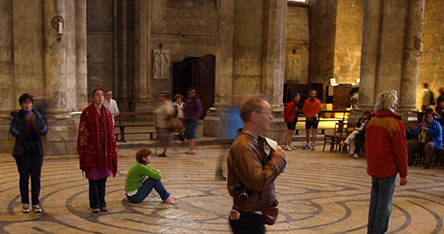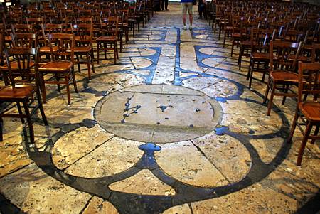 Did the Knights Templar place an image of the Minotaur (human-bull) in its center? Was it removed after most Templars were murdered? Six Templar crosses, lit by candles, on 6 columns surrounding the Labyrinth 'protect the pilgrim on its journey to the center (Jerusalem)':