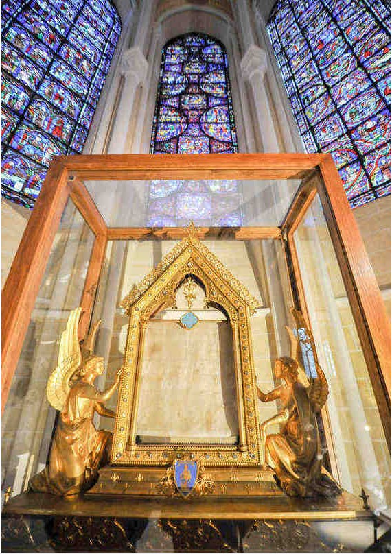 With Palestine pollen in it, dated 1st century, Emperor Charles the Bald gave this piece of oriental silk to Chartres in 876. Its preservation in the 1194 fire, was regarded as miraculous.