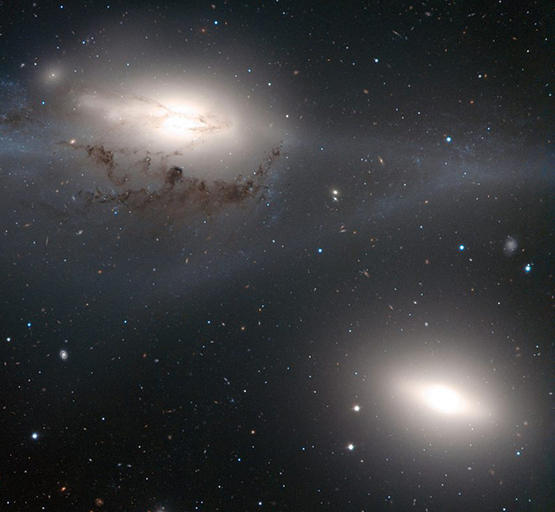The Eyes Galaxies are 2 interacting galaxies. One has a distorted disk and tidal tails as a result of interacting with other galaxies, thus hard to classify it as a spiral or lenticular galaxy. They are ≈52 million Lyrs away.