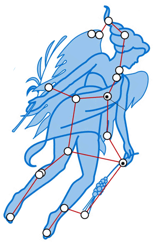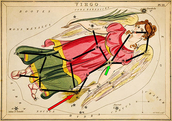 The constellation Virgo is usually associated with the Greek goddess of justice, Dike, the daughter of Zeus and Themis, and depicted with angel-like wings, and in her left hand, an ”ear of grain” which in Latin means Spica, Virgo’s brightest Star. She is located next to Libra, representing the scales of justice. Dike was also known as Astraeia, daughter of Astraeus, the father of the stars, and Eos, goddess of the dawn. Virgo is also identified with Demeter, the corn goddess Atargatis, who is the Syrian goddess of fertility, Erigone, the daughter of Icarius, and Tyche, the goddess of fortune.