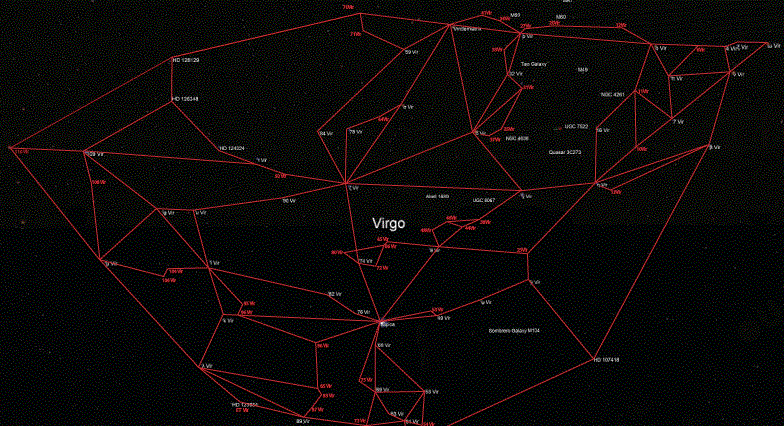 The Virgo Constellation forms a 'bowl' with Spica as center, within which lie the Stars but also 2000 galaxies, together called the Virgo Cluster, 55 million Lyrs away from Earth.