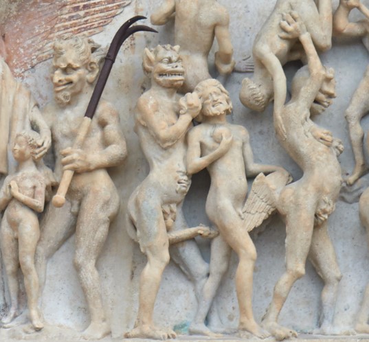 Among the damned we can spot a man with a money-bag (being avaricious?), who is pulled by his hair by the devil. The damned has a rather sorry expression, perhaps due to the fact that the devil’s tail, which has its own head (!), is biting the man’s thigh. His tail has a phallic shape, and it is obviously reaching towards the man’s intimate areas: