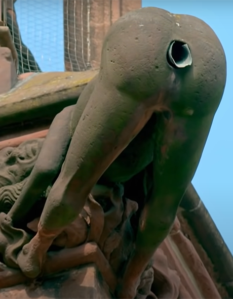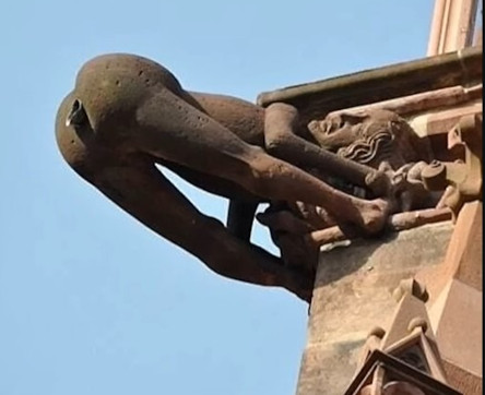 The bas-relief on one of the pillar's capitals in the nave of the ND of Strasbourg represents a satirical procession, in which a pig is seen carrying a holy stoup, followed by donkeys dressed in priestly clothes and monkeys bearing various religious attributes, and a fox enclosed in a shrine. It is the “Procession of the Fox or the Feast of the Donkey”.