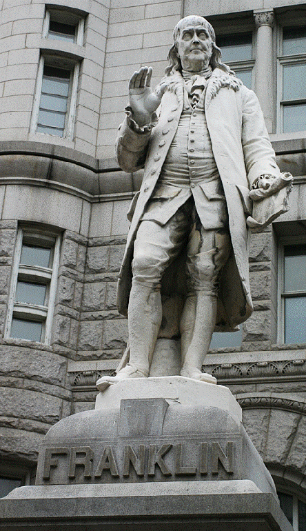 The silhouette of the upper part of the tower represents a pyramid, with a ratio similar to the pyramid on top of the Washington Monument. Its bottom edge equals the width of the campanile, and appears to be the same width as the diameter of the Sun. Thus, during the days before August 10, we have nothing less than a symbolic reversal of the pyramid image on the Seal of the United States. The solar light touches the top of the pyramid, on a later day slides through it, and then on subsequent days begins to pass beneath the pyramid, to be occulted by the masonry of the tower. Does the statue of Franklin, on its pedestal below the campanile, hold up its hand in amazement at this solar wonder?