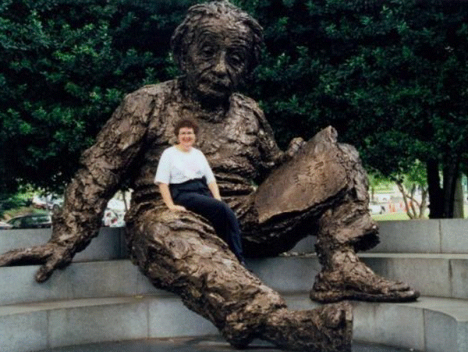 The marble surrounding the bronze EINSTEIN statue includes stainless steel studs which reveal the positions of more than 2,700 stars and 10 quasars, including our Sun, Moon, planets, and asteroids Ceres, Pallas, Juno, Vesta. In the circles' center is the North-star Polaris. In fact, it really is a 28-ft diameter horoscope for April 22, 1979, when the statue was dedicated.