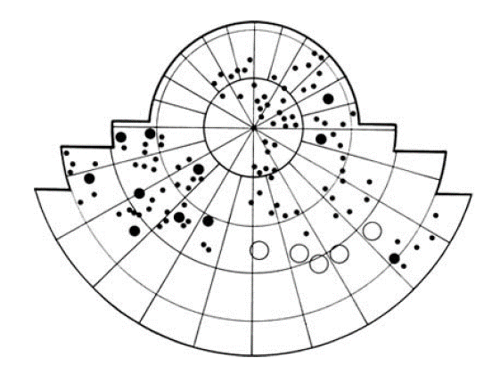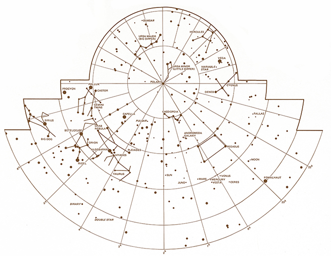 The black dots are the projections of important stars, while the circles represent planets. Above is a graphic key to them, with the stellar patterns marked in the form of the familiar constellations. Their numbers correspond to the below stars, constellations, and planets: