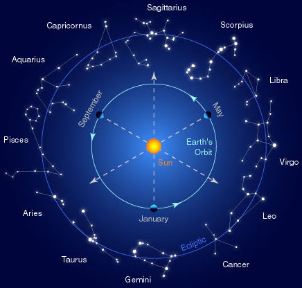 As the Earth travels around the Sun, the Sun appears to pass in front of a succession of constellations. The linear path that the Sun describes across the sky is called the ecliptic. The constellations on that path are collectively called the zodiac and extend a few degrees above and below the ecliptic line.