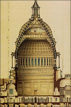 The first US Capitol dome was built from 1793 till 1824, mimicking the Pantheon in Rome. This low dome was constructed of wood covered by copper. Light was admitted through an oculus. This created various problems. Thus, the 2nd dome drawing showed a new cast-iron dome with columns, pilasters, brackets, scores of windows and a crowning statue. The entire dome was restored again in 2017.