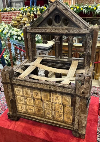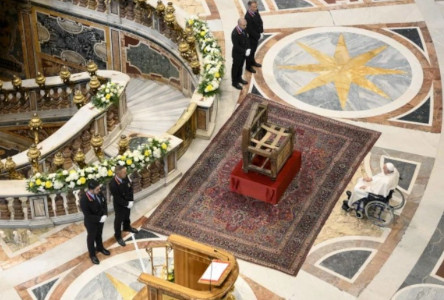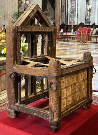 Pope Francis decided to show the newly-restored chair (knights of Columbus) to the public on 27 October 2024, in front of the baldachin. Then, the next day in front of the right front pillar, until 8 December 2024: