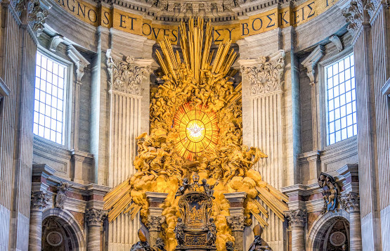 The bronze-gilded throne is set against a backdrop of golden clouds, above the main altar, which is composed of black and white marble from Aquitaine and red jasper from Sicily. On each 22 February, Bernini’s monument is illuminated with over a hundred candles: