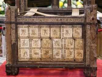 Archeologists determined that only the acacia wood skeleton of this chair in its current form dates back to Peter's period. The rest of it is composed of oak, bound to the original skeleton by strips of iron. It is believed to be a reconstruction, made just before Charles’ gift and coronation. This includes 18 ivory plaques featured in the bottom portion of the throne, depicting sketches of Hercules and various constellations: