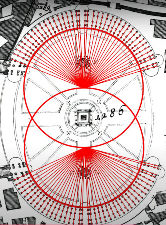On the "oval-shaped square" are two places that are marked on the central axis from where the rows of 4 colonades become one. See above.