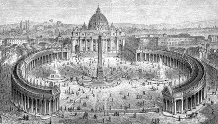 At the center of the "square" is the Vatican obelisk, an ancient Egyptian obelisk. A granite fountain constructed by Bernini in 1675 matches another fountain designed by Carlo Maderno.